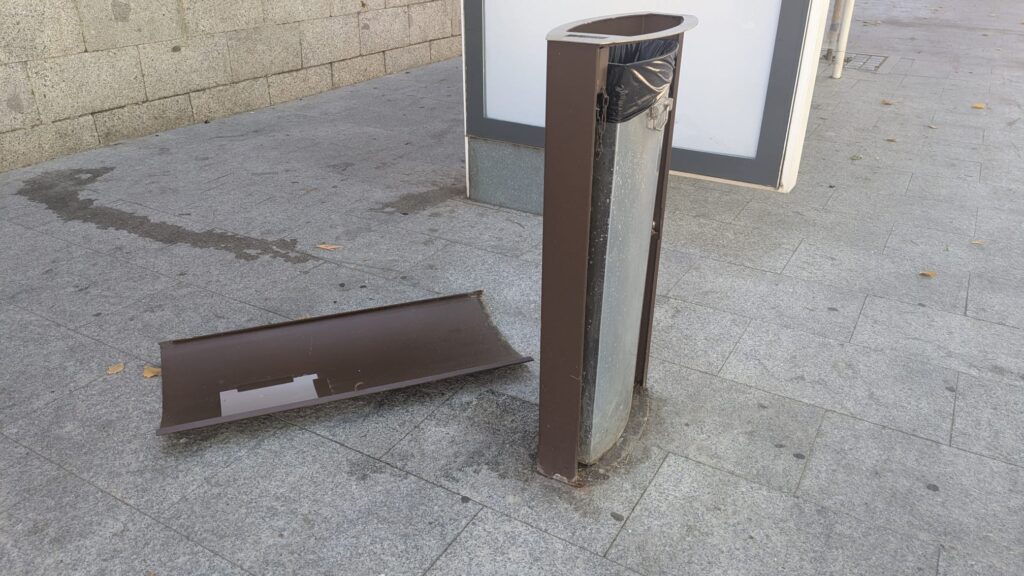 Han advertido que algunas de estas papeleras, al estar rotas o oxidadas, provocan que la basura se derrame en las aceras, generando manchas difíciles de eliminar y malos olores. Además, han alertado de que ciertos elementos presentan bordes cortantes o zonas con óxido, lo que supone un riesgo para los peatones, especialmente para los más pequeños.